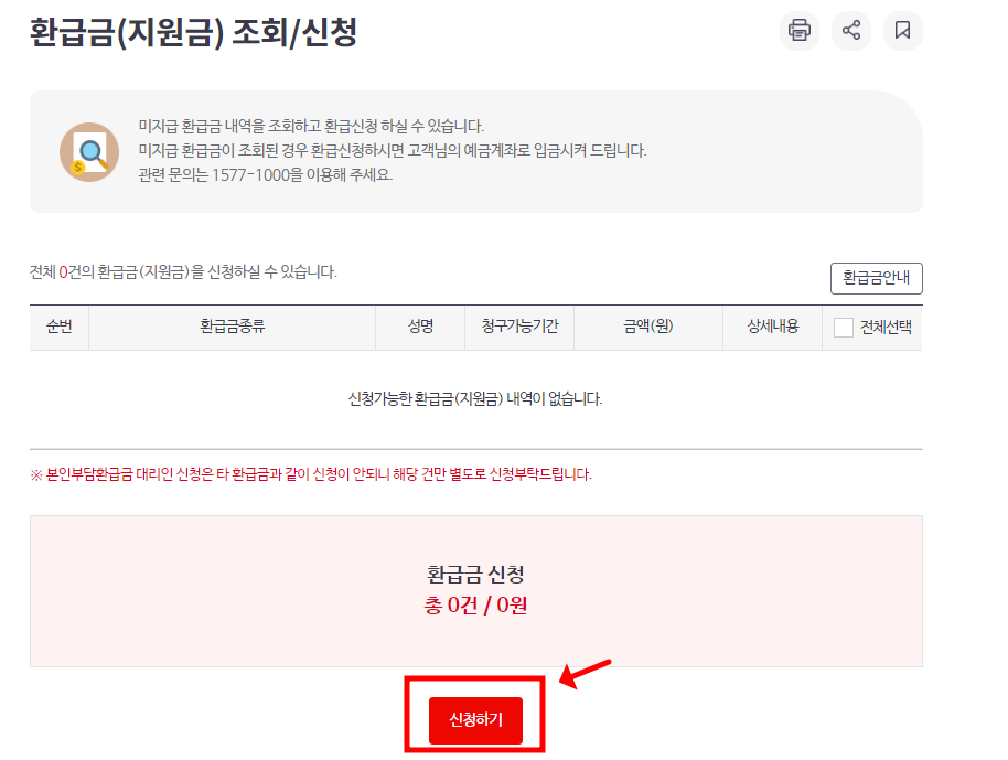 환금금 조회/신청 란의 환급금 종류/성명/청구가능기간/금액/상세내용 을 확인할 수 있습니다. 조회 내용을 확인후 신청하기를 클릭합니다.