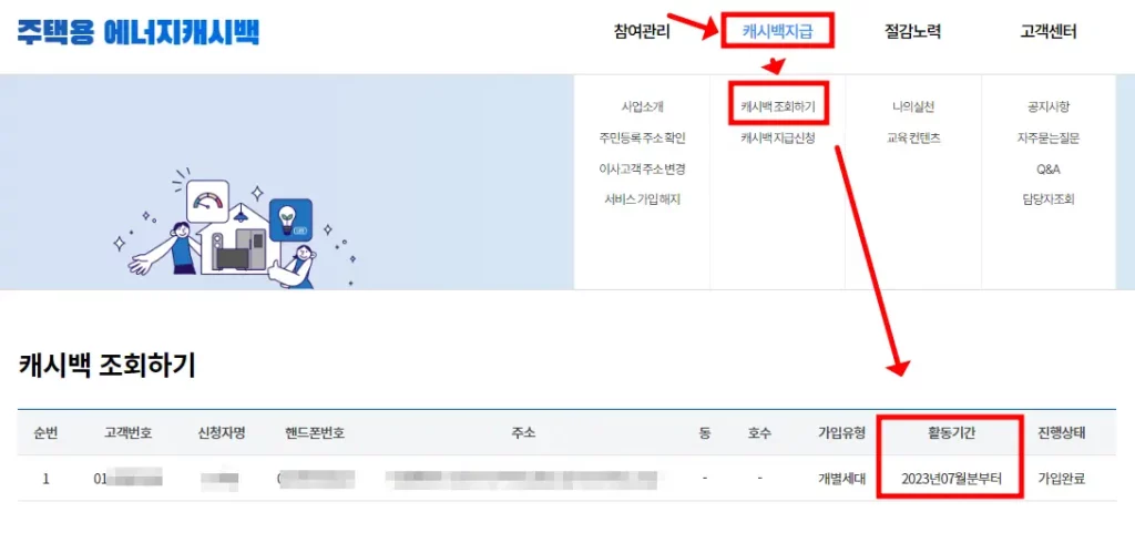 - 주민등록 주소 확인 및 에너지캐시백 참여 확인하기를 클릭합니다.